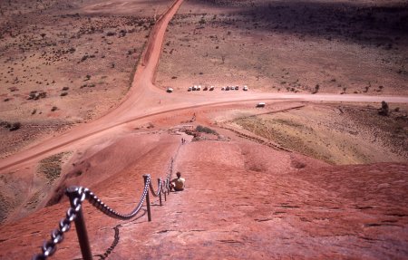 Actually the trip down is much scarier than the trip up. Here is a photo of the view going down. Watch out, don’t trip! During the years we were there was at least one fatality a year at the Rock