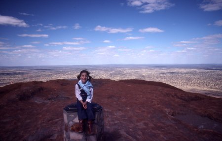 Later in the day we climbed Ayers rock –except for Gwen and Sara. Sara wanted to go but Gwen would not let her. In the photo below we are resting after the climb and Claudia is sitting on the marker on the top of the Rock.
