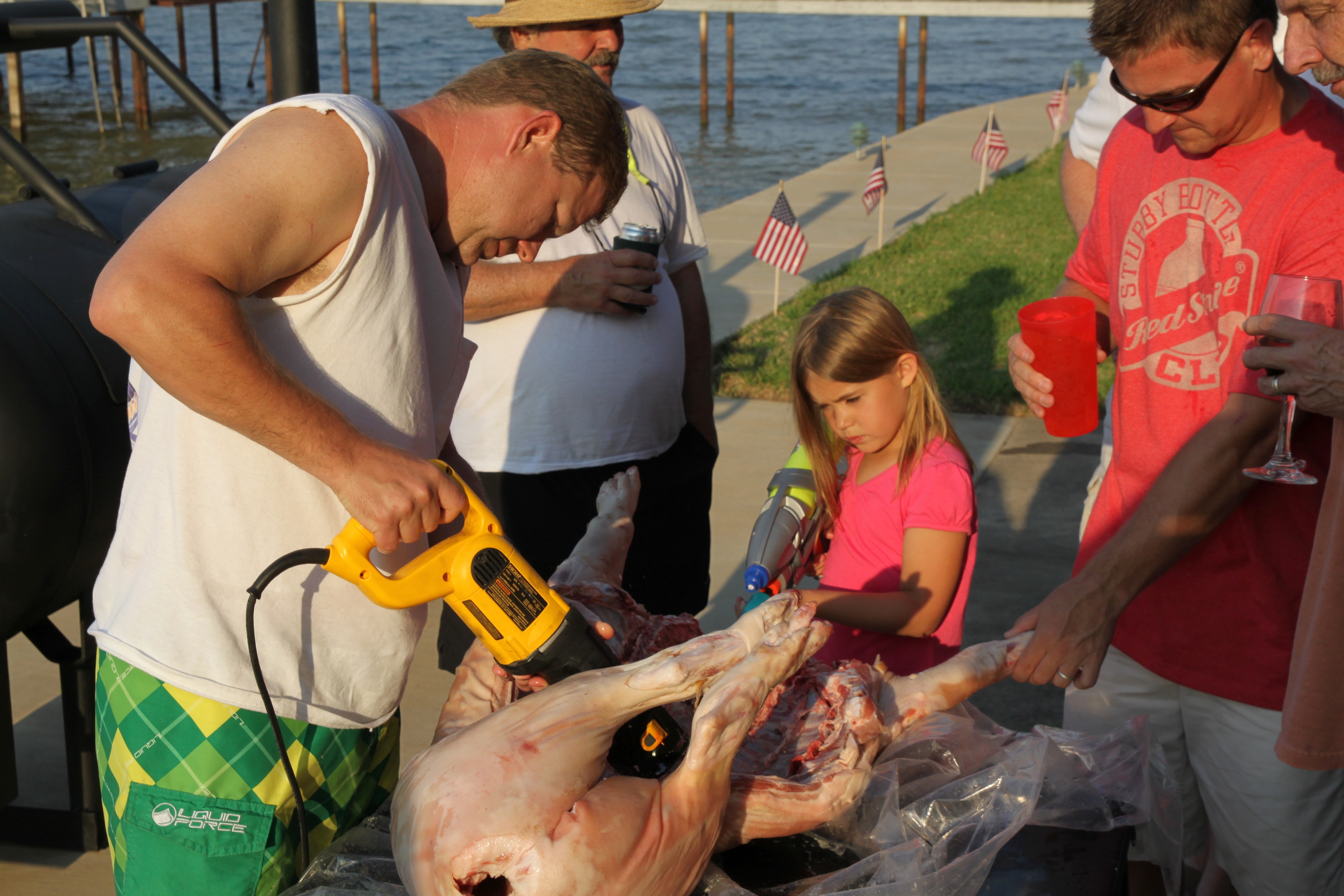 Son in law, Chris, is preparing a pig for their Memorial Day barbecue. Daughter Campbell is, of course, helping.