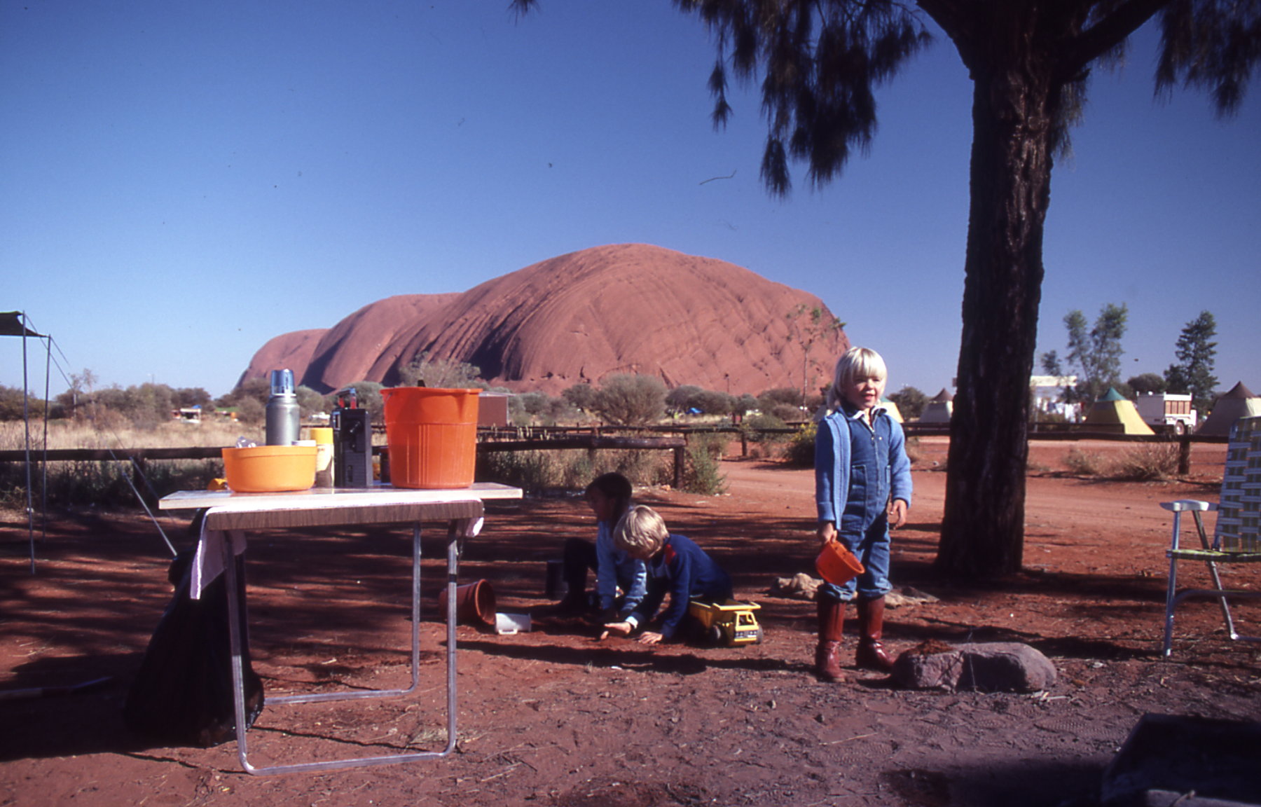 I came across some old photos of a camping trip we took to Ayers Rock with the Wilson’s in 1980. Back then you could camp right next to the Rock. Now days you camp 30 miles away. My how things have changed. Sara is standing up front in the photo below. I suppose she is trying to tell me something. Andy and Claudia are happily playing in the dirt.